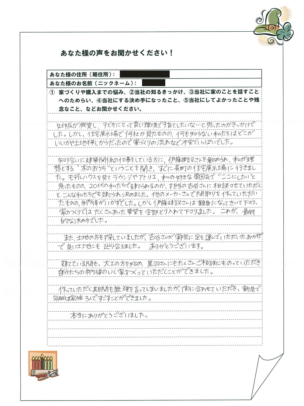 知り合いに建築関係の仕事をしている方に、伊藤建設さんを勧められ、私が理想とする"木のおうち"ということを聞き、すぐ長町の住宅展示場に行きました。