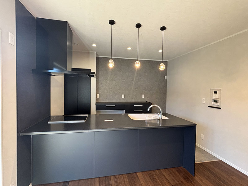 背面のグレーのアクセントクロスや、天井に灯るガラスのペンダントライトが黒いキッチンに奥行きを与えています。