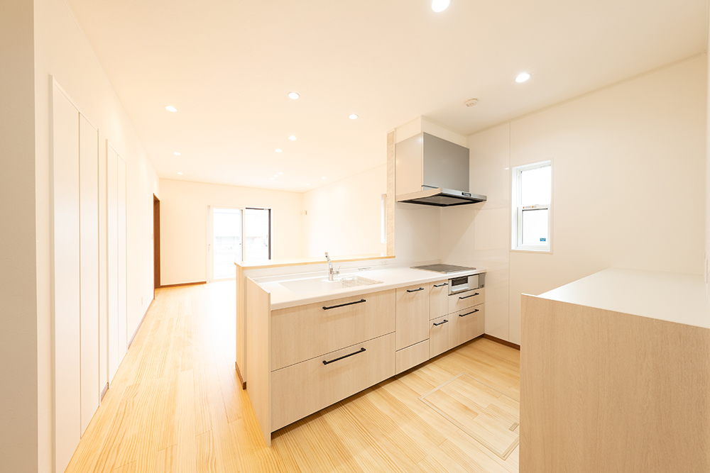 キッチンからリビングまで遮るものなく見渡せる直線的な配置により、家族とのつながりを感じられる開放的な空間を実現しました。